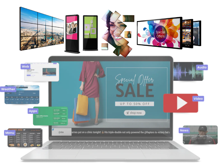 Utilize displays interativos, painéis e vitrines digitais em diversos pontos em uma rede ilimitada e gerenciada remotamente.